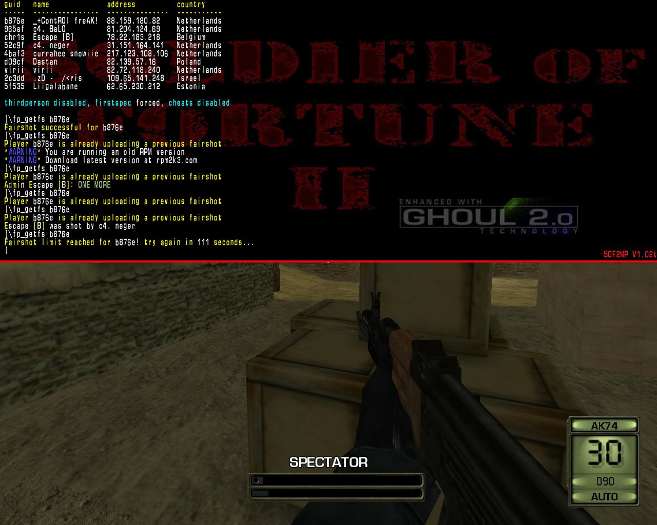 Fairplay Anticheat Software is an application made for Soldier of Fortune II: Double Helix. It has been the prominent anticheat software since 2007 and is used daily by players of the demo and full versions of the game. Fairplay continues to grow as the creation of a sof2 player named Shifty. Fairplay anticheat's purpose is to provide a fair, cheat-free platform for video game users to be able to play with each other without the bother of hackers and cheaters, both competitively and non-competitively.